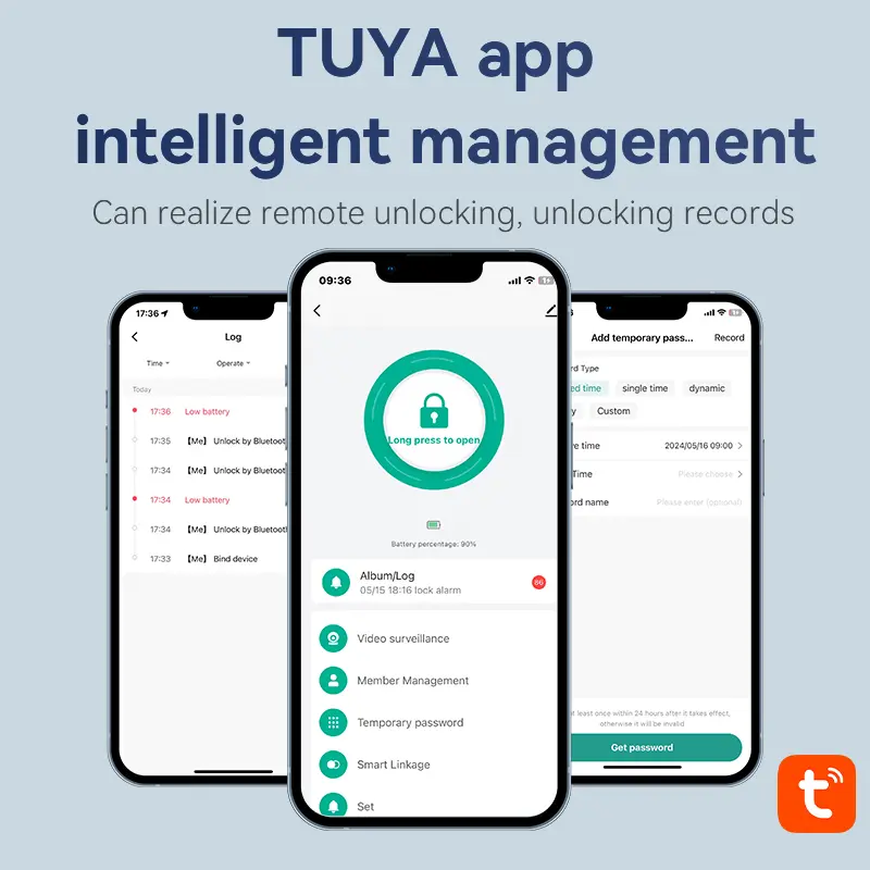 - Déverrouillage à distance de l'application intelligente : appuyez pour déverrouiller à distance via une application dédiée, pour faciliter l'accès des invités et la gestion de la maison.