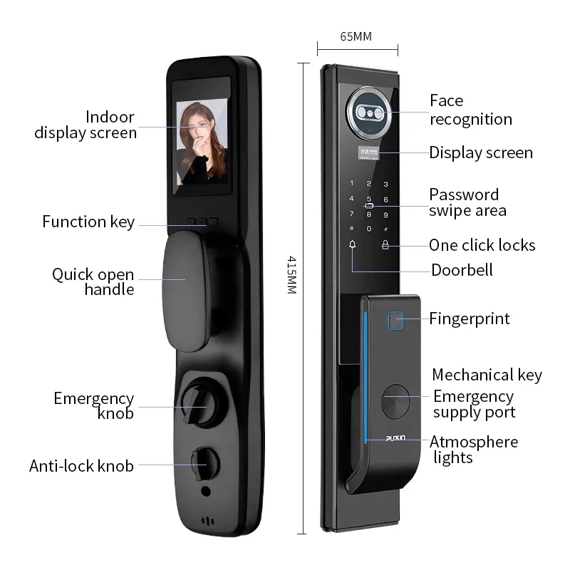 Équipée d'un écran intérieur haute définition, la serrure a un corps en alliage de zinc haute résistance (anti-indiscret, antirouille) et une conception à faible consommation (autonomie de la batterie de plus de 12 mois avec alarme de faible puissance). Son aspect simple et élégant s'adapte à différents styles de décoration.